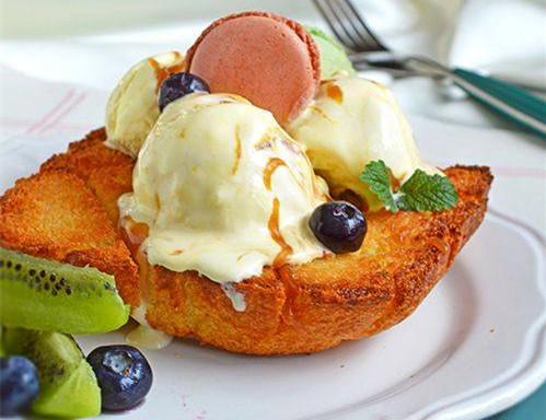炎熱的夏天,就算是早餐或是下午茶點,也總是想加入點涼爽的元素。加了冰激凌的吐司花樣吃法是不錯的選擇。